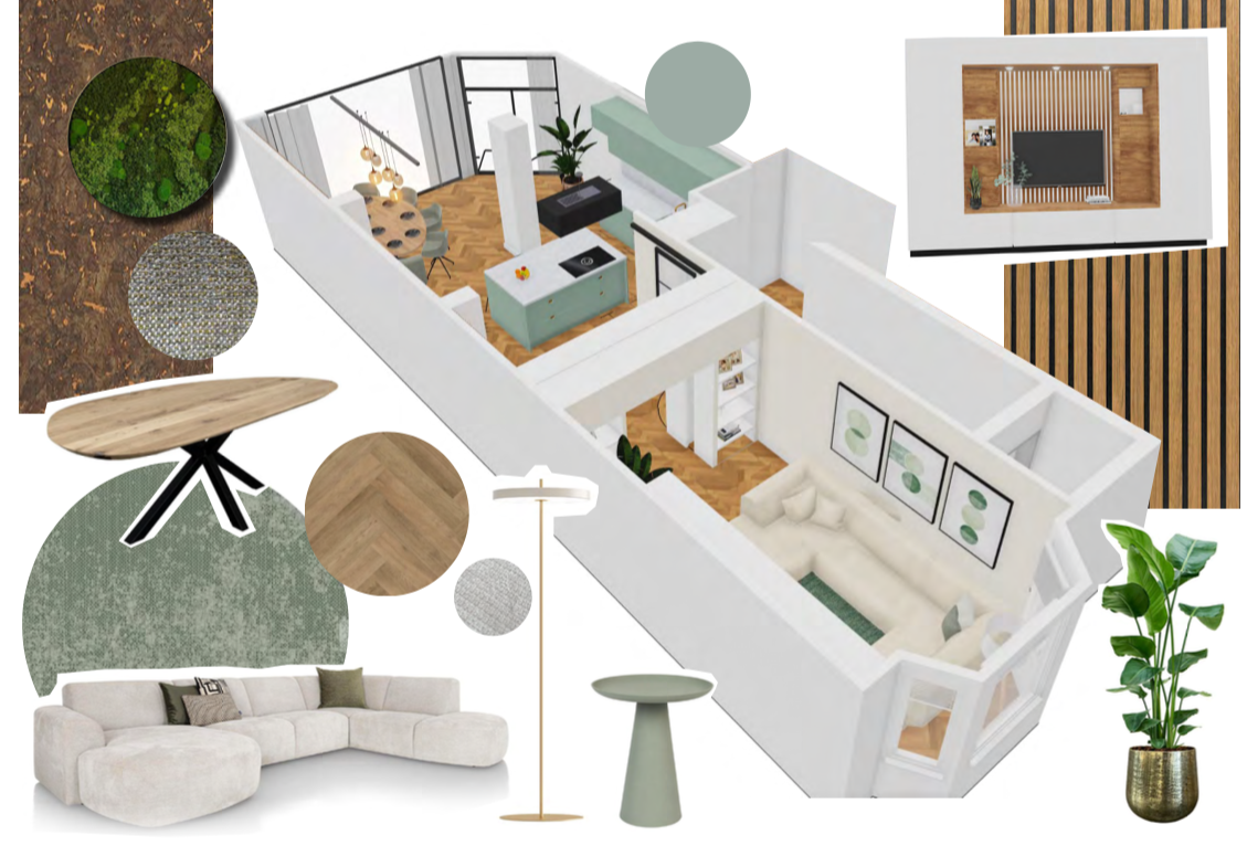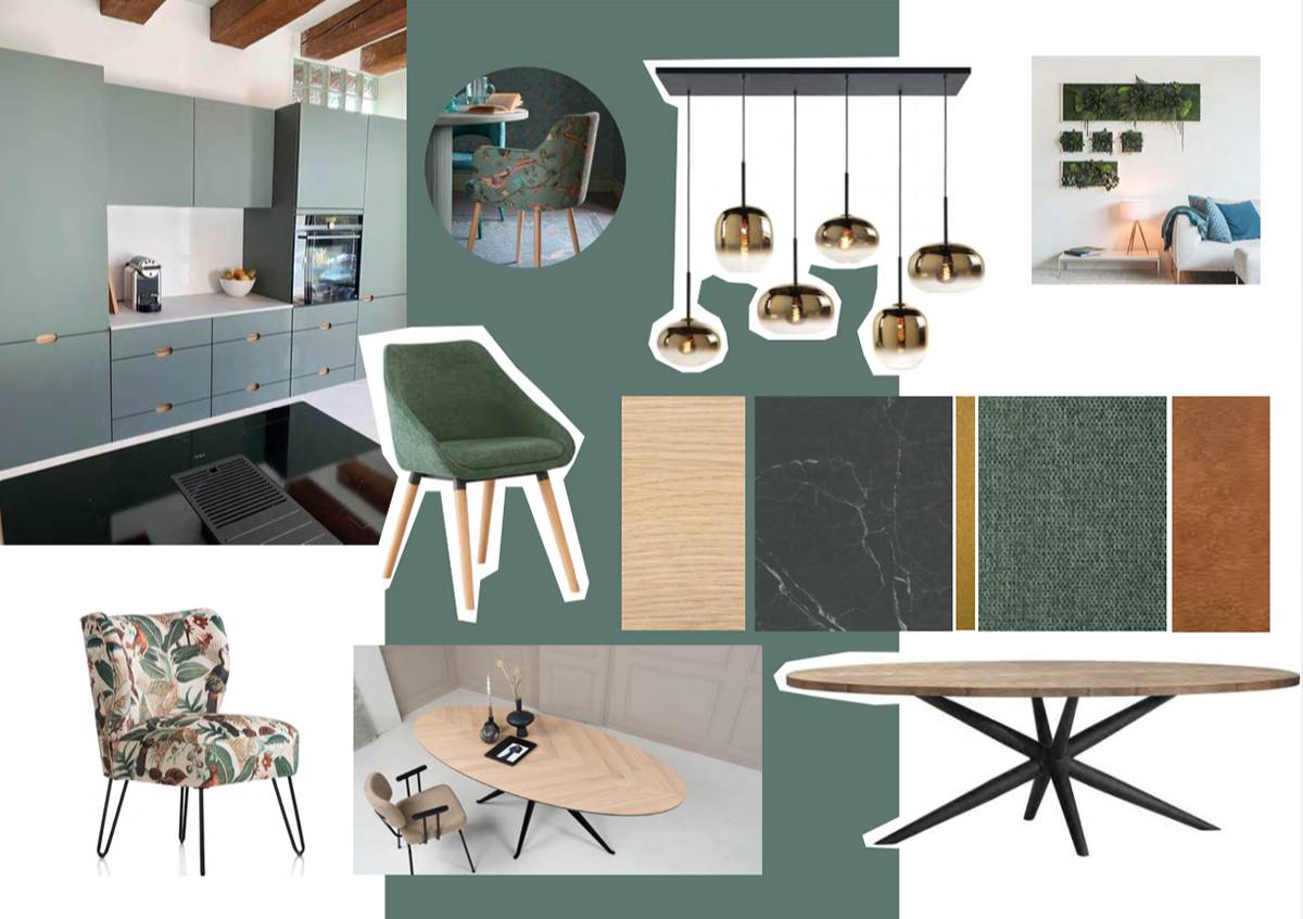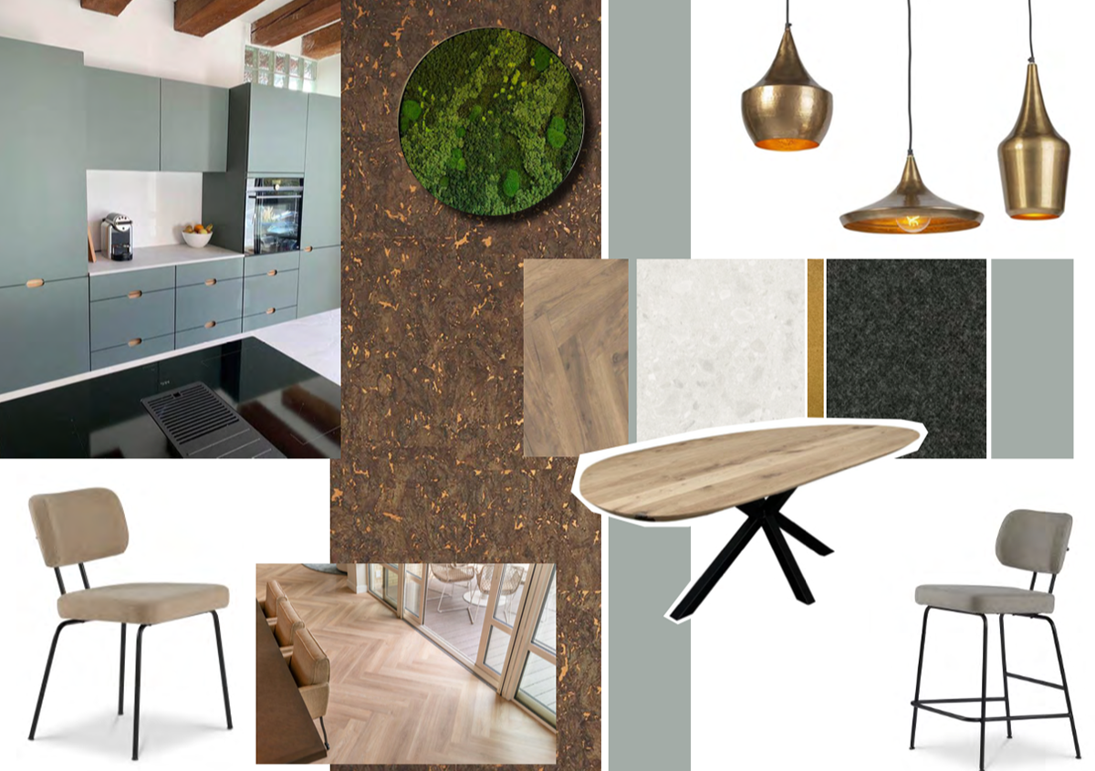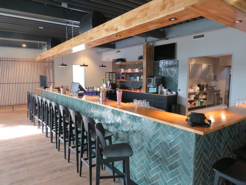 De vernieuwde sportkantine ademt rust en balans, geïnspireerd door de Japanse tradities en vechtkunsten. Het interieur combineert strakke lijnen met natuurlijke materialen: verschillende houtsoorten en groene accenten zorgen voor een serene sfeer. Een op maat gemaakte bar in betonlook om de dojo in te kijken, met bijpassende stoelen met een lage rugleuning om het zicht zo min mogelijk te belemmeren. De kleuren zijn rustig en harmonieus: aardetinten, warm hout, grijstinten en zachtgroene accenten. De bar werd volledig zelf gemaakt en ook hier werd de betoncire toegepast om een zachte uitstraling te creeeren. De sfeervolle verlichting geeft de bar een goudkleurige gloed.