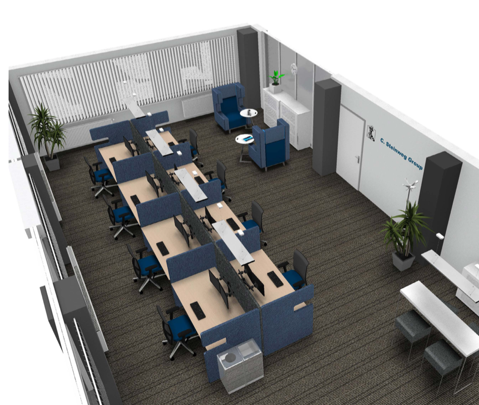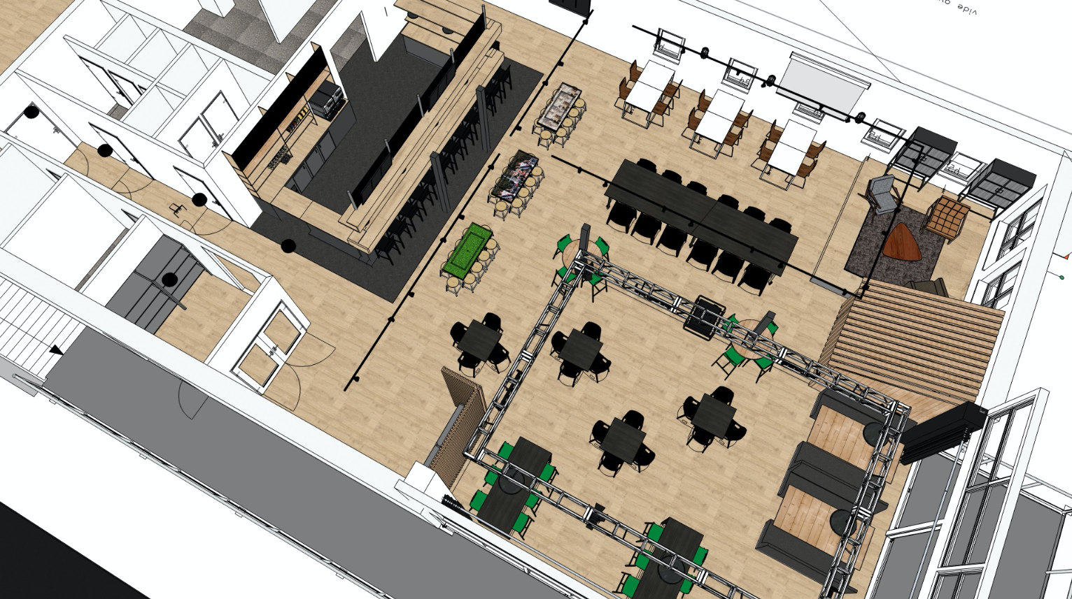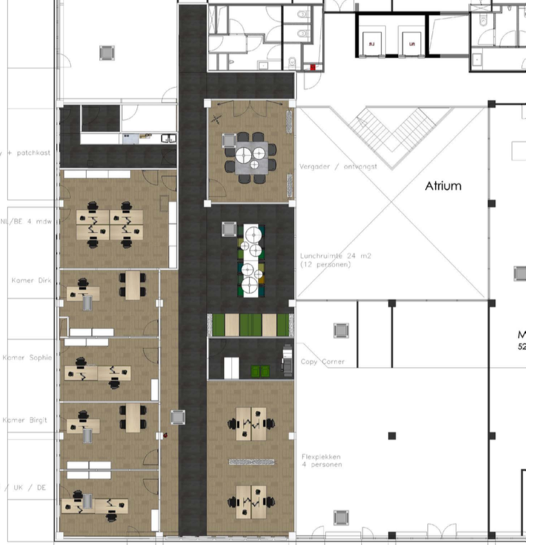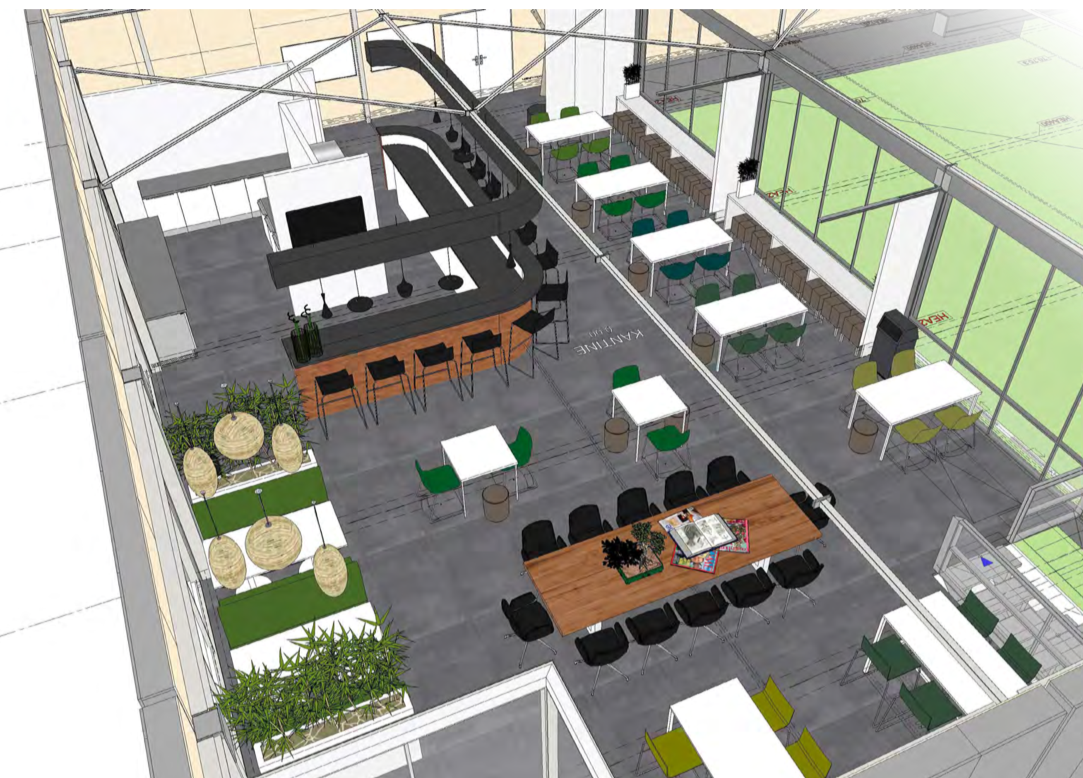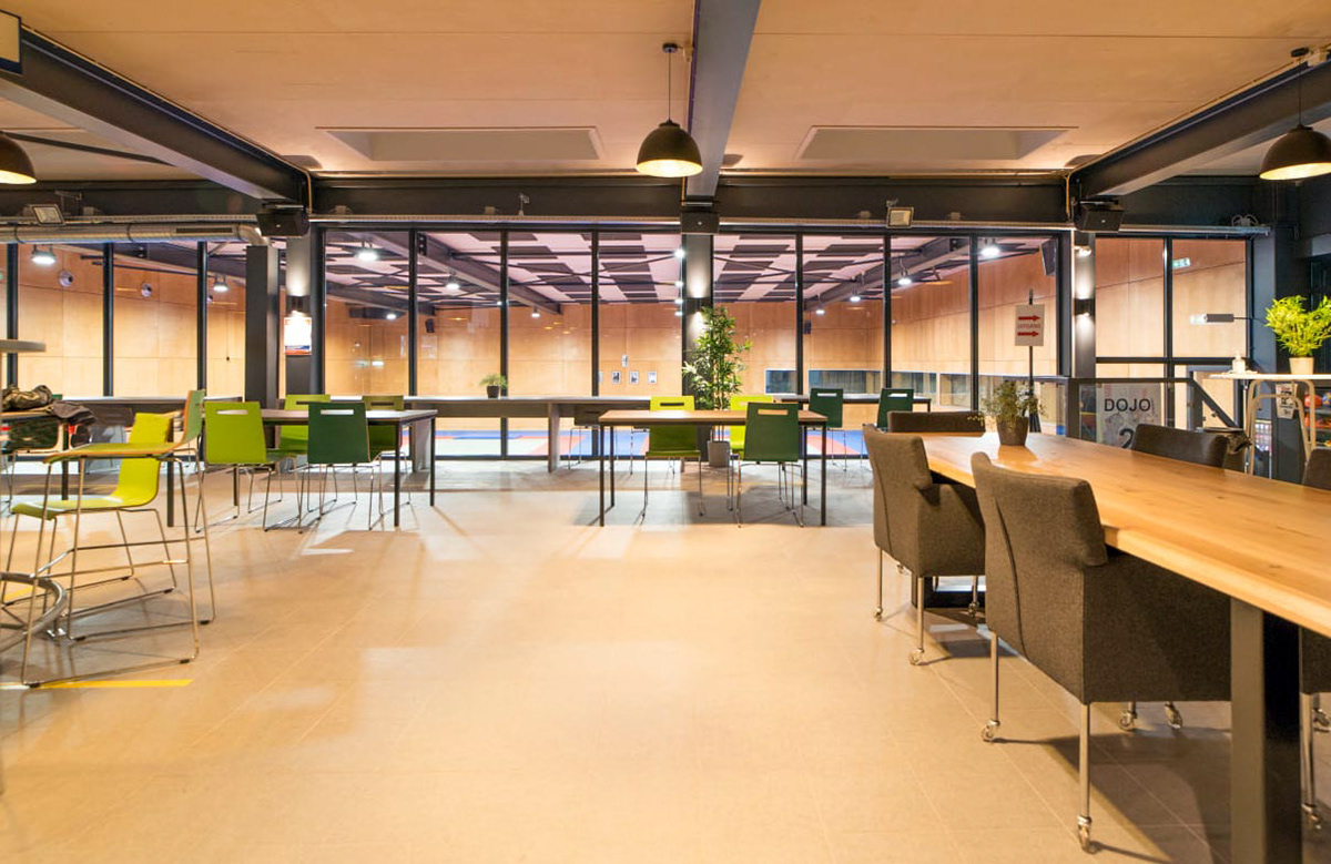 Deze kantine is ook te huur voor evenementen en bijeenkomsten — hierdoor moest de ruimte haar flexibele karakter houden om zo breed mogelijk gebruikt te kunnen worden.